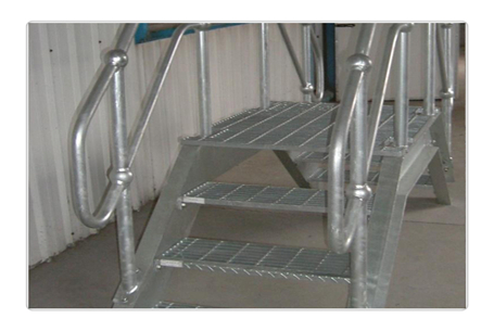 4、T4踏步板:負(fù)載扁鋼和橫桿按一定間距經(jīng)緯排列,帶有防滑前護(hù)板和側(cè)板螺栓固定的踏步。
